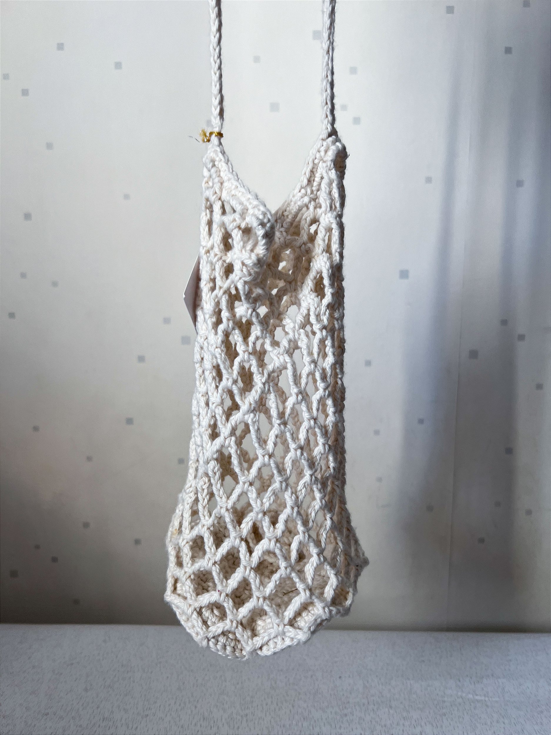 Bolsa de Crochê Redinha para levar a garrafa, algodão cru, feita à mão, que pode ser dobrada e guardada dentro da Flor!