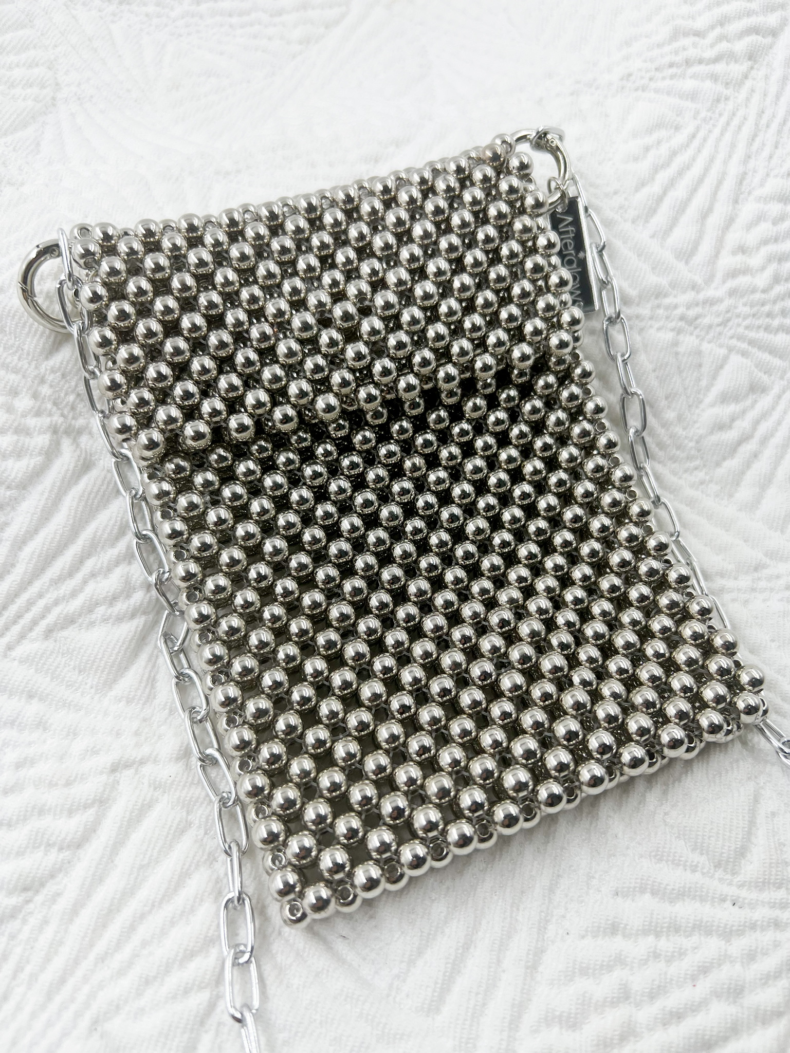 Bolsa Crossbody transversal de Pedraria prata de Luxo, beaded bag, confeccionada manualmente com pedras ABS, com fecho em imã e alça de correntes prata, o tamanho da alça é regulável.